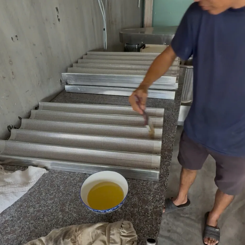 Hướng dẫn khách hàng rửa sạch mâm nướngThoa một lớp dầu mỏng lên mâm bánh mìMâm bánh mì được sấy kỹ để bánh mì không bị dính trên khay nướng