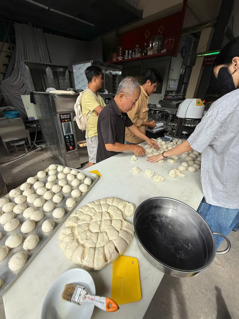 Nhào tròn sơ khối bột trước khi cho vào khay ( để phủ bột đồng đều hơn, không sai lệch cho bột đã chia)