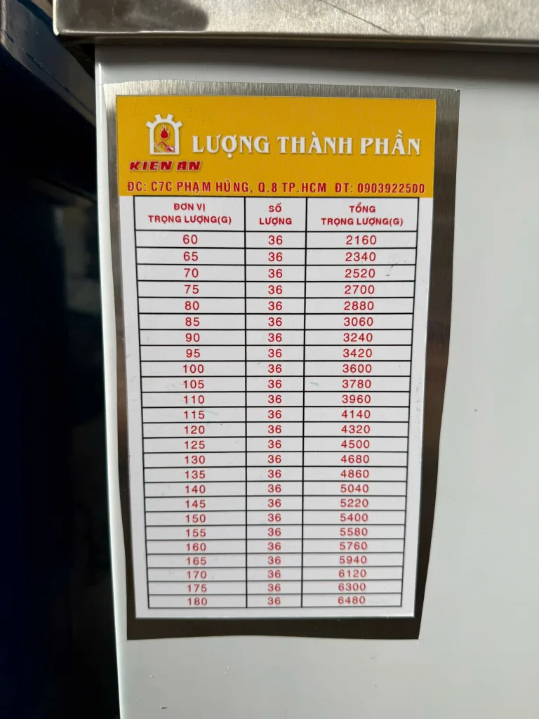 Cân tổng khối bột theo trọng lượng mong muốn ( có bảng định lượng mà bên công ty Kiến An đã in trên máy).