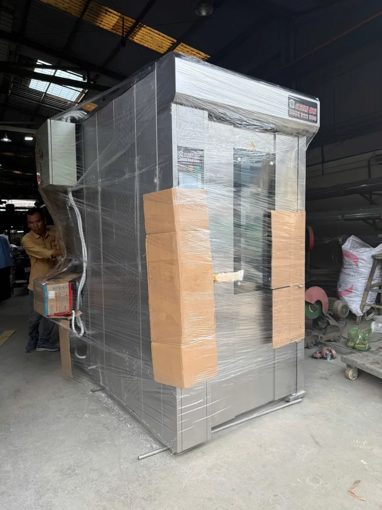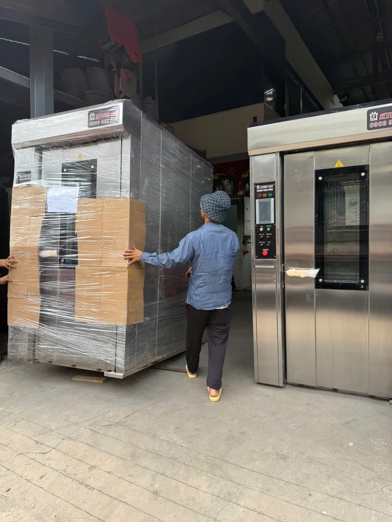 Lò xoay hoặc lò đối lưu với số khay linh hoạt (6–32 khay), giúp nướng bánh chín đều và ổn định.