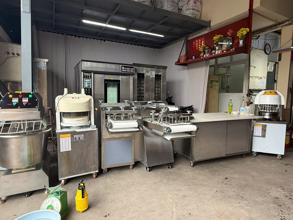 Bao gồm: máy trộn bột 8 kg/mẻ, máy chia bột 36 phần, máy ve bột, tủ ủ bột ~20–32 khay, lò nướng xoay 6 khay.