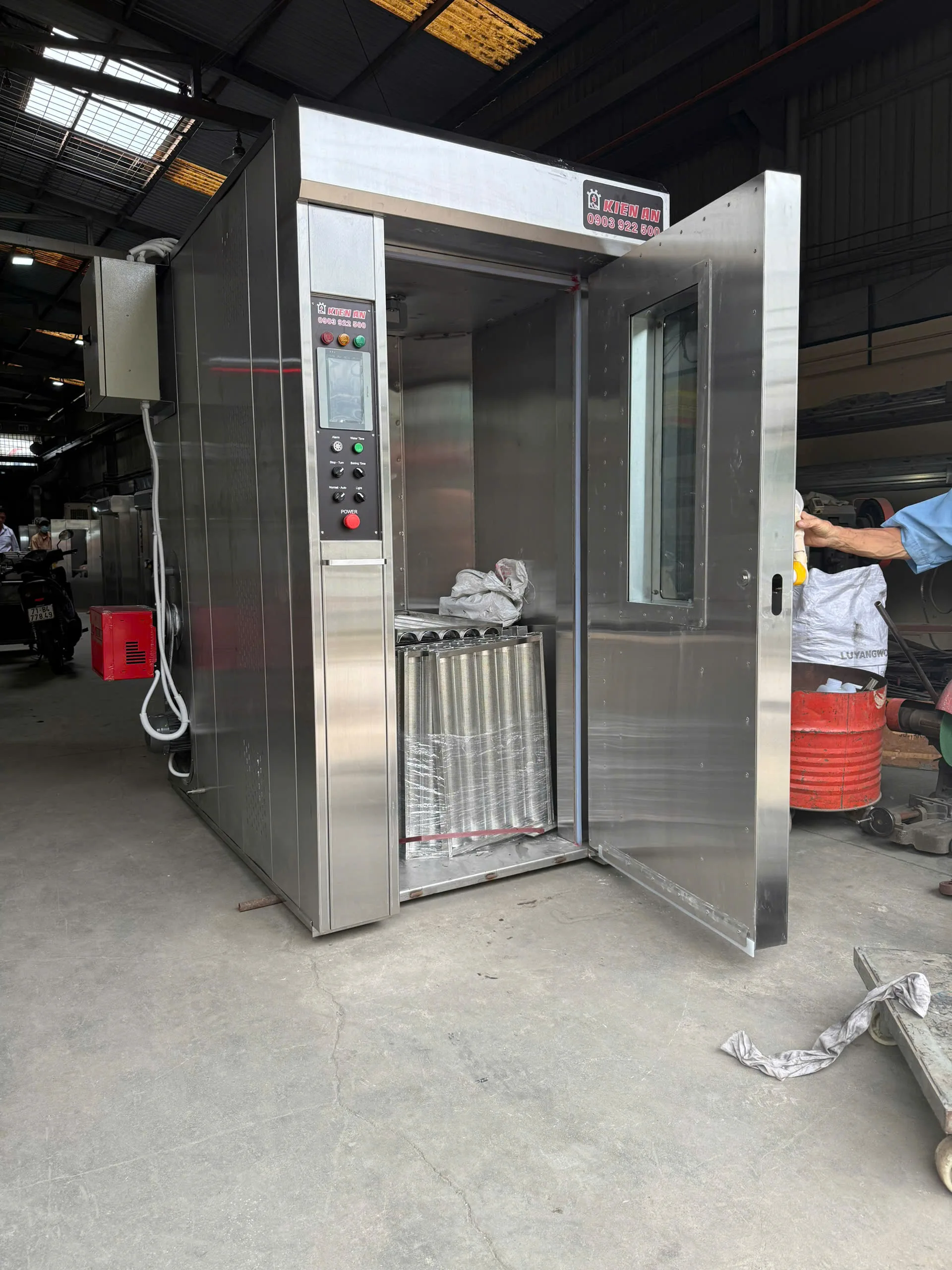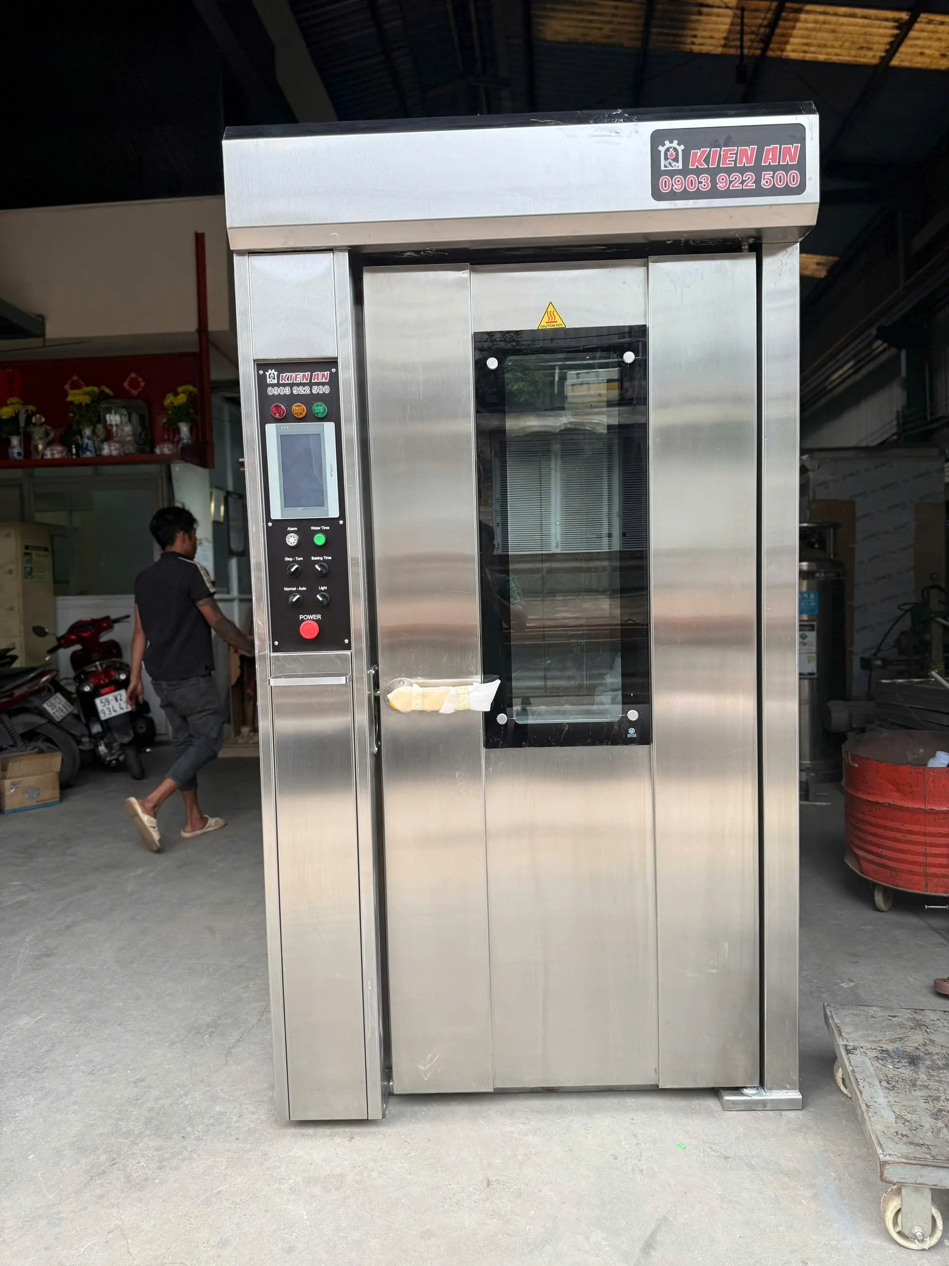 Lò xoay Kiến An là một loại lò nướng công nghiệp chuyên dùng để nướng bánh mì số lượng lớn. Điểm đặc biệt của lò này là hệ thống khay nướng xoay liên tục trong quá trình nướng, giúp bánh chín đều, vàng giòn và có chất lượng đồng nhất.