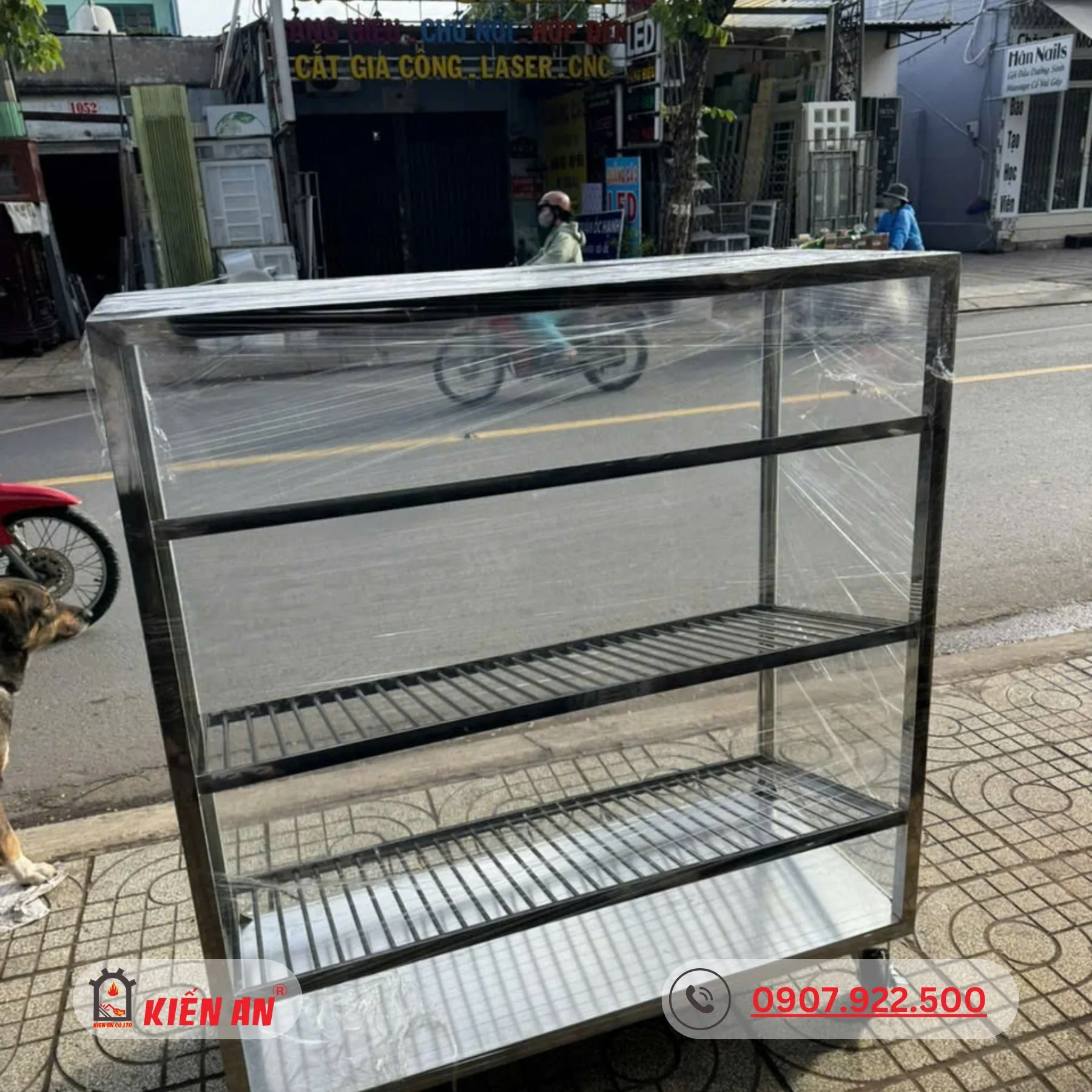 Tủ kính giúp bánh an toàn, sạch sẽ và chuẩn VSATTP, tạo cảm giác yên tâm cho khách.