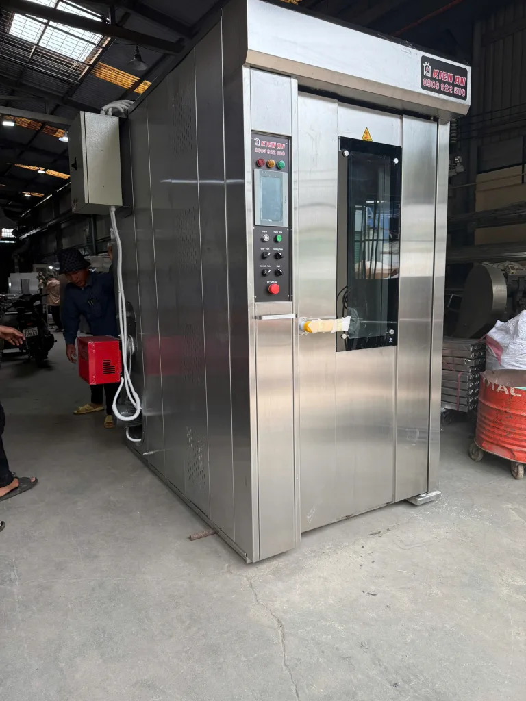Lò bánh mì Kiến An là lò nướng công nghiệp với hệ thống quay đối lưu (xe mâm xoay bên trong), giúp nhiệt lượng phân bố đều quanh thực phẩm. Ưu điểm là nhiệt ổn định, chín đều, công suất lớn — phù hợp nướng bánh mì theo mẻ.