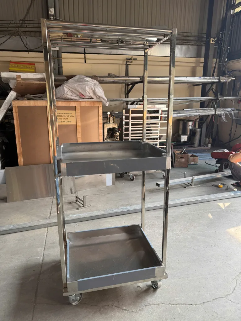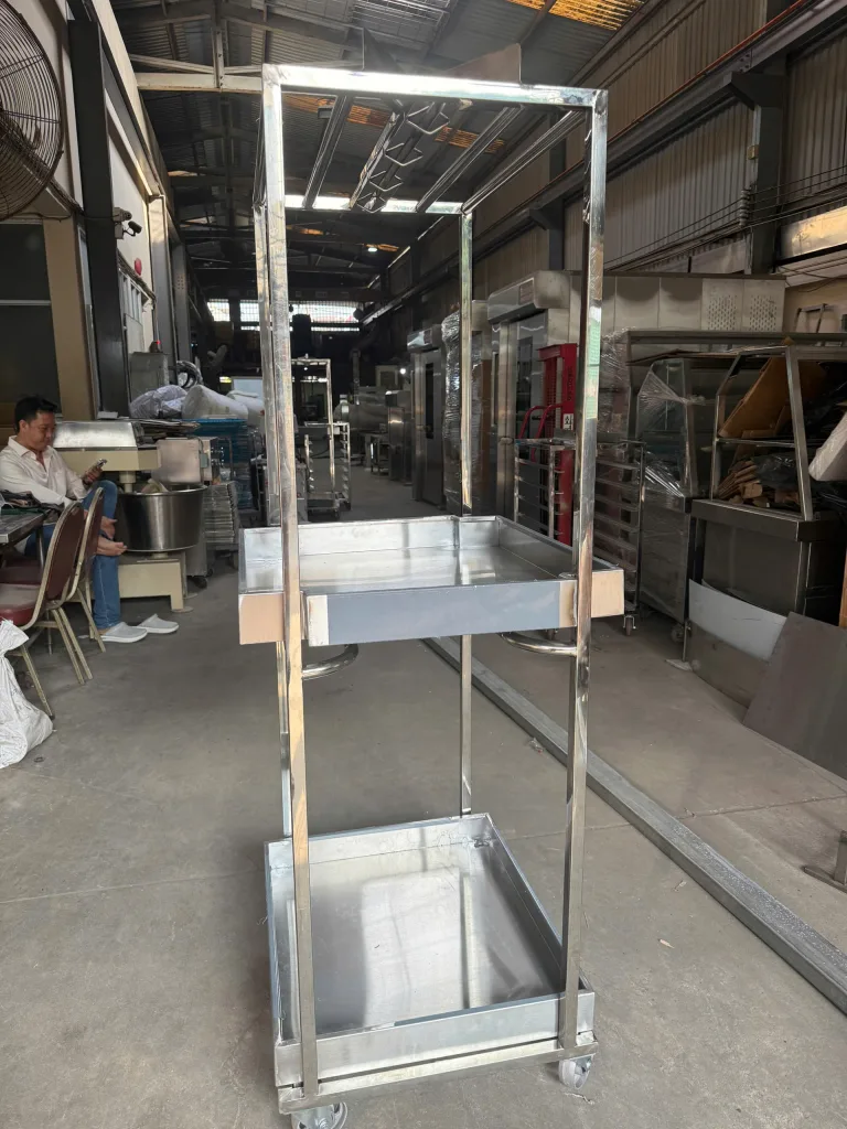 Khung xe inox chắc chắn, có bánh xe chịu lực