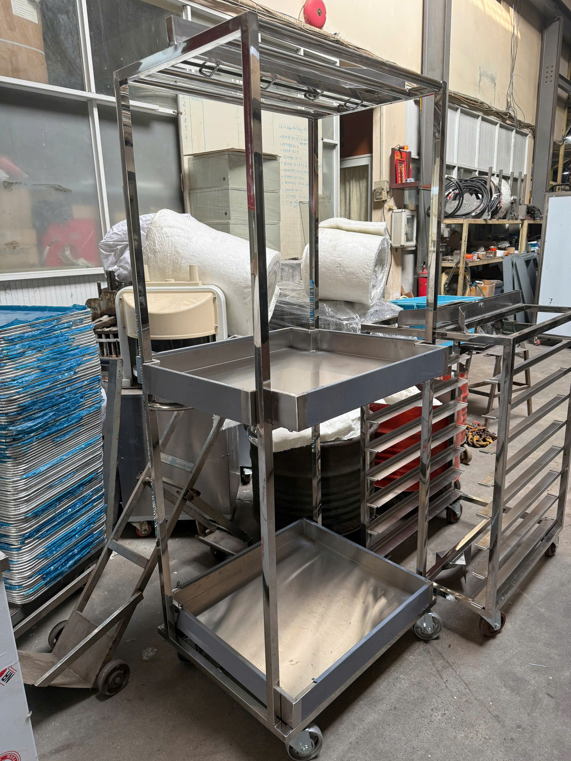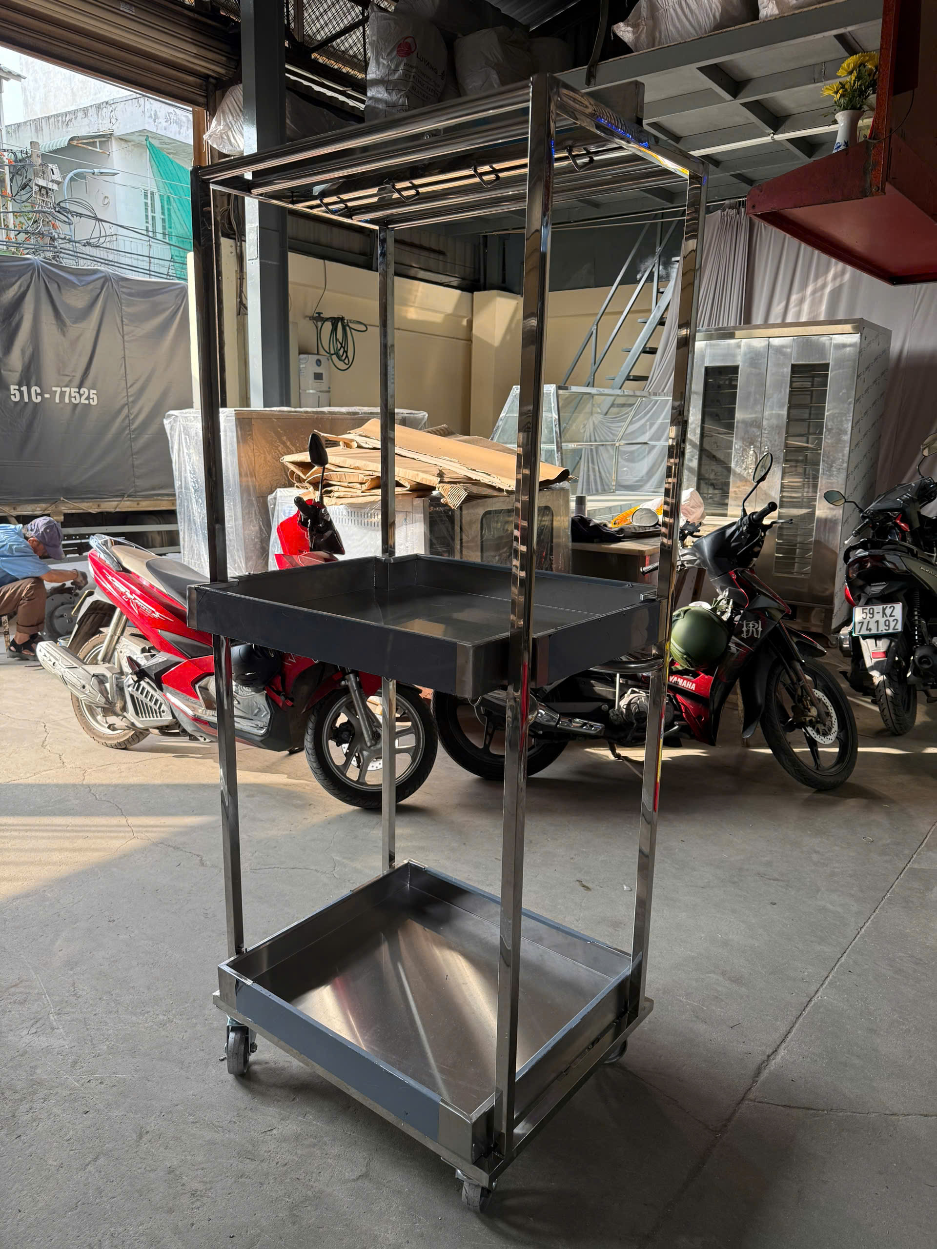 Khung xe inox chắc chắn, có bánh xe chịu lực